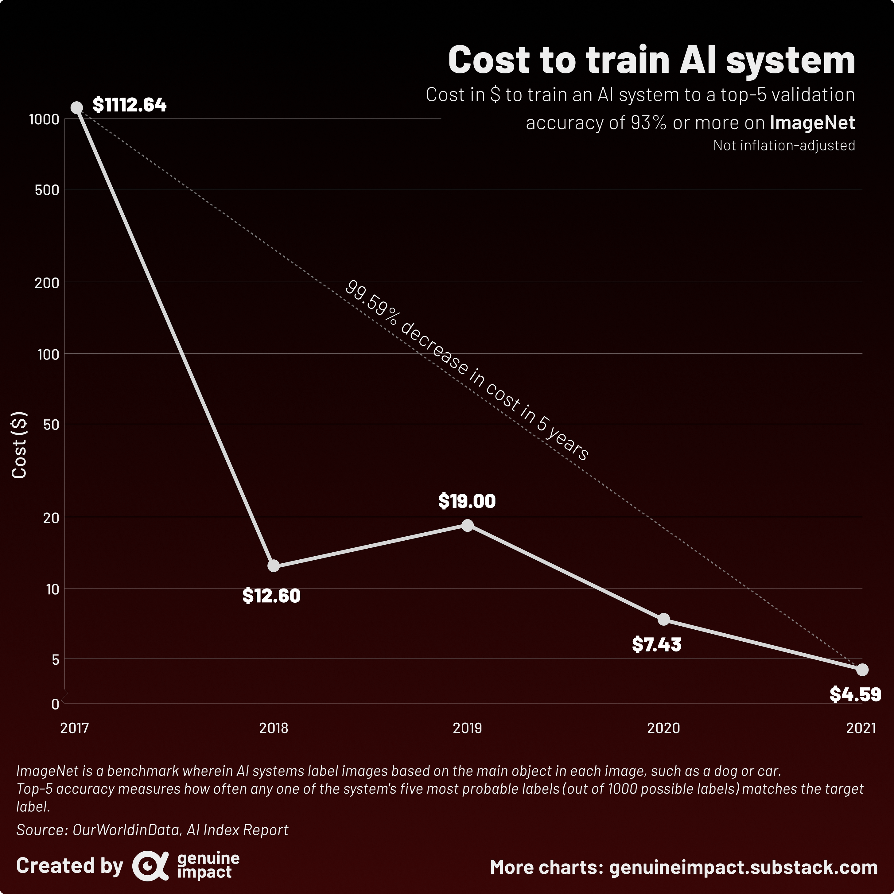 Despite the $100m price tag for training Large Language Models, as a broader trend training AI systems has gotten cheaper and cheaper over the last decade