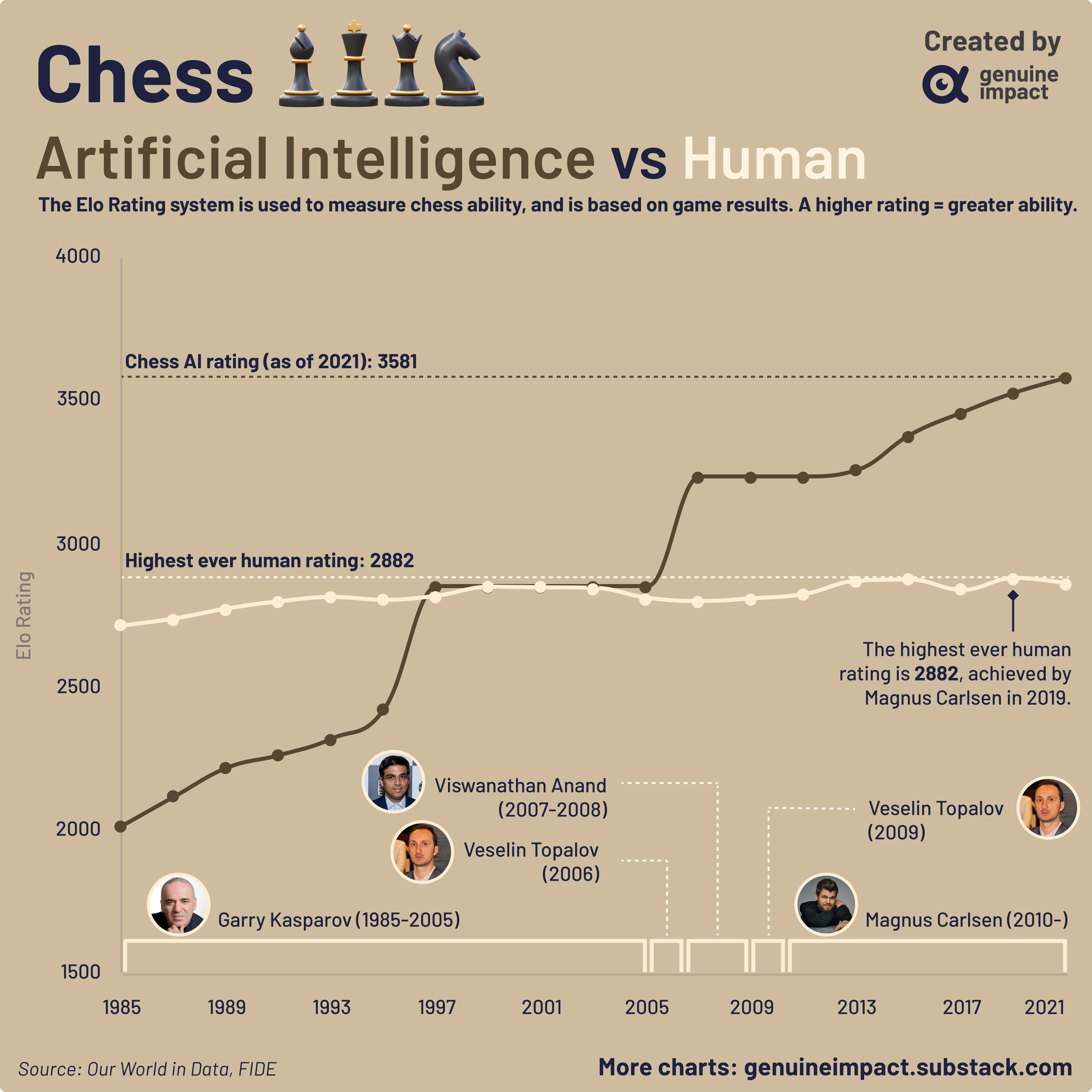 Lastly, looking at the ELO rating of Chess AIs shows us just how exponentially more powerful these models are becoming compared to even peak human performance