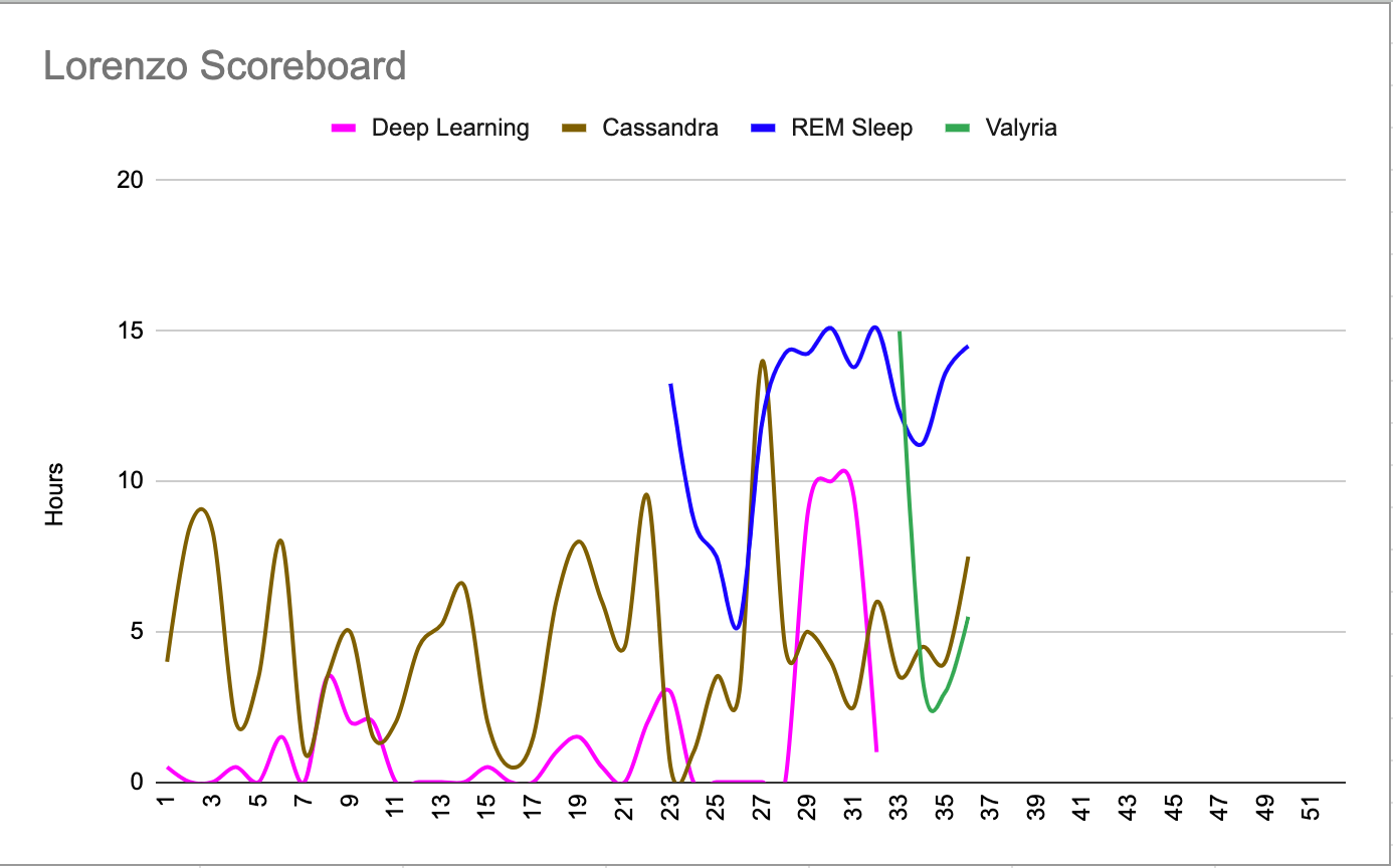 Personal Scoreboard: following the input-over-output philosophy, I now track how many hours I am able to allocate towards the top 3 priorities (it looks like 4 bc Valyria has replaced Deep Learning) in my life so that I can slap myself with the reality of just how little Deep Work (I don’t count meetings) I really get done every week — it’s now a staple of the Productivity Gym