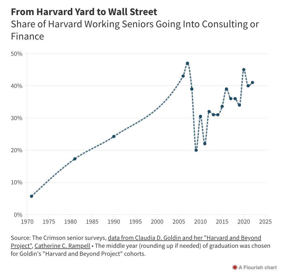 “Designed by a former banking analyst and Harvard Business School alumnus named Ray Soifer, the Harvard Business School Index looks at what portion of Harvard Business School graduates take “market-sensitive jobs” — a subset of the financial services category that includes investment banking, investment management, private equity, venture capital and hedge funds. When the portion exceeds 30%, it’s a sell signal. If the number is below 10%, it is a long-term buy signal.” (cite)