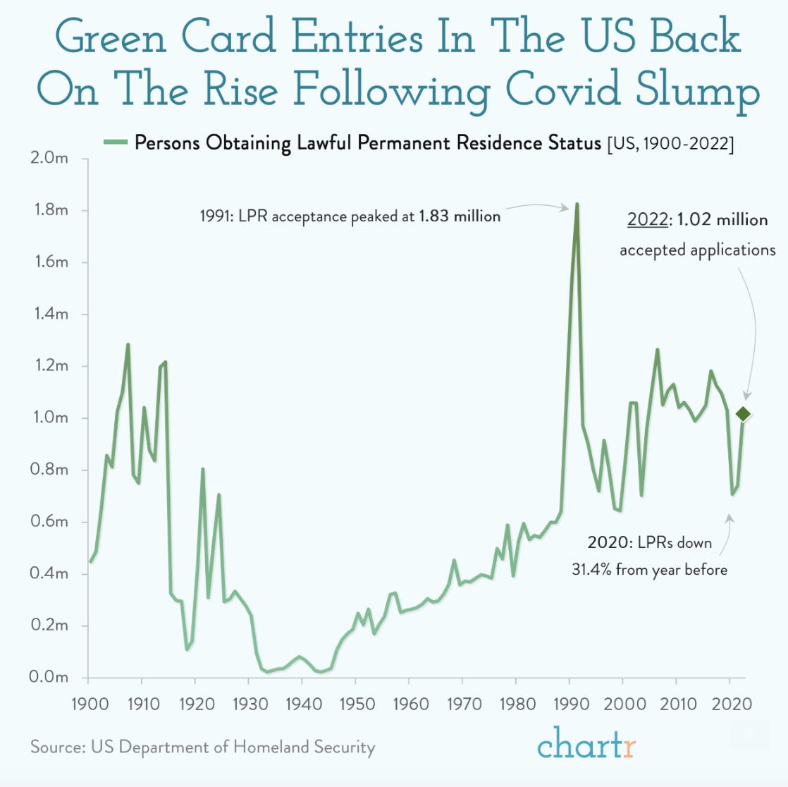 As I prepare for #GreencardSF, it’s useful to look at the data on how many Greencards have been given out over the last century