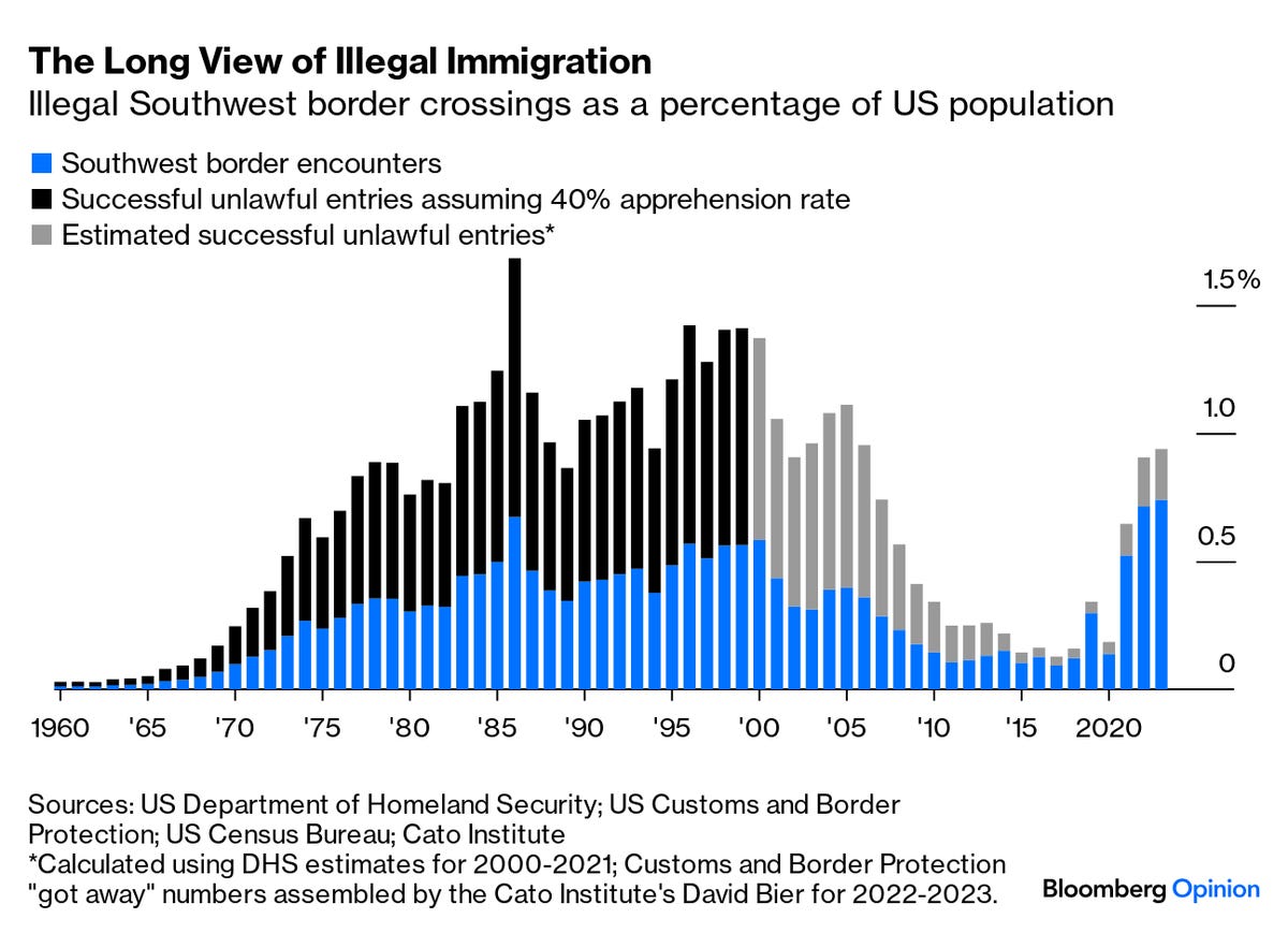It’s also interesting to see illegal immigration as a function of overall population growth in the US — estimates show that we are nowhere near the 80s….